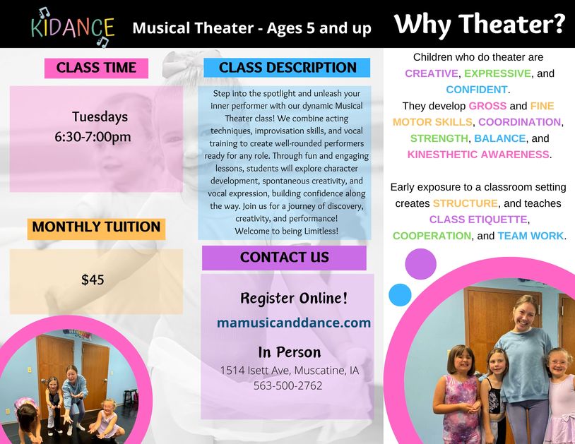 Combo Classes, Ballet, Tap, jazz, Hiphop, Poms, Tumble, Flexibility/Conditioning, Musical Theater (sing, dance, act)!