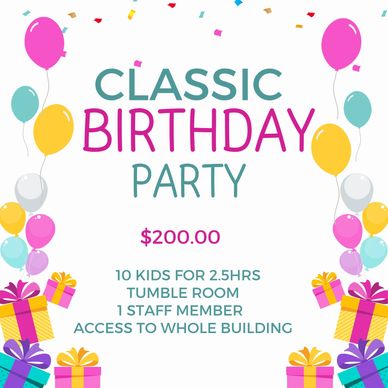 Bring back the joy of classic birthday celebrations with our all-inclusive Classic Birthday Party Package, featuring exclusive access to our incredible Tumble Room. This package combines the best of traditional party elements with a unique and exciting twist, ensuring an unforgettable experience for your child and their friends.