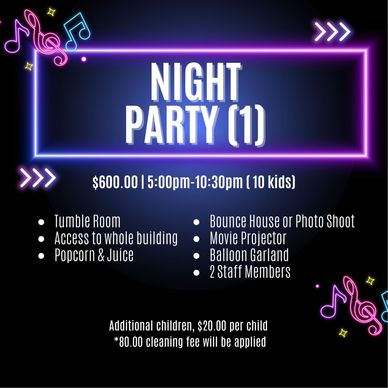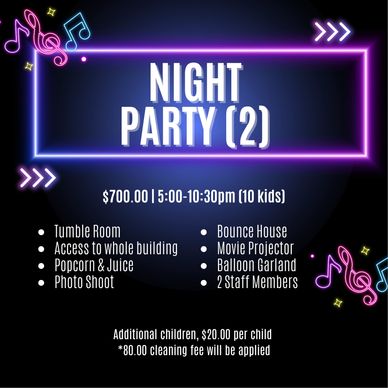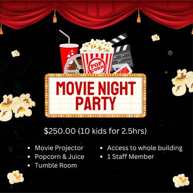 Transform into a cinematic experience with our Movie Night Extravaganza! Enjoy the thrill of the tumble room, then bring your blanket to settle in for a movie. We provide the projector, screen, juice, and tasty popcorn to make it a night to remember. Add our bounce house for an extra touch of magic!