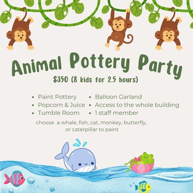 Unleash your child's creativity with our Creative Crafts Package! In addition to hours of tumbling excitement, kids can express their artistic side with pottery painting. Each guest will paint a unique piece to take home, making the party both fun and memorable. Plus, our themed balloon garland sets the scene for a colorful celebration!