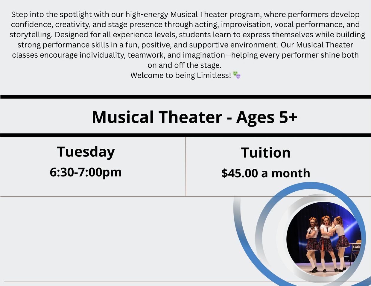 Book your FREE 2-Week Class Pass and experience our Theater Program firsthand. This is the perfect way to meet our instructors, explore our programs, and see what makes Limitless Performing Arts Academy special. No pressure — just movement, creativity, and confidence. Come be Limitless! ✨
